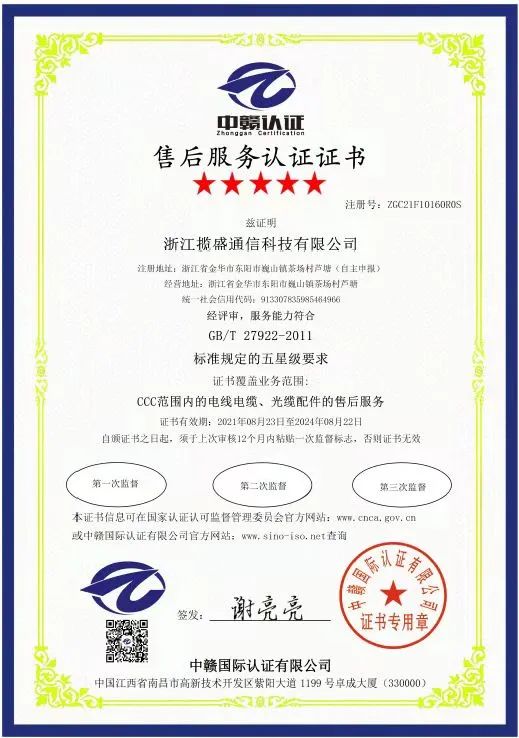五星級售后服務認證的獲得及兩次通過監督審核,不僅證明了浙江攬盛通信科技股份有限公司擁有完善的售后服務體系和響應制度,而且具備強大的售后服務團隊支撐。現公司已擁有三級服務管理師7名,二級服務管理師兩名。各級服務網點各配備一名售后服務人員。
